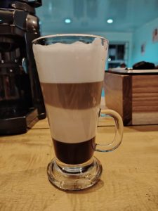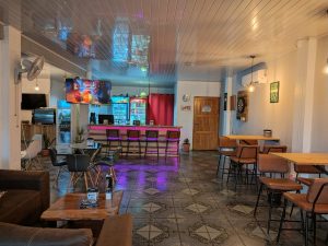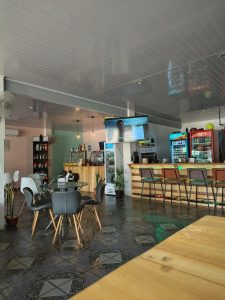 - Un área de cafetería con 13 mesas (en estructura metálica con base de vidrio), y una barra rústica en madera, para una capacidad total de 50 personas.